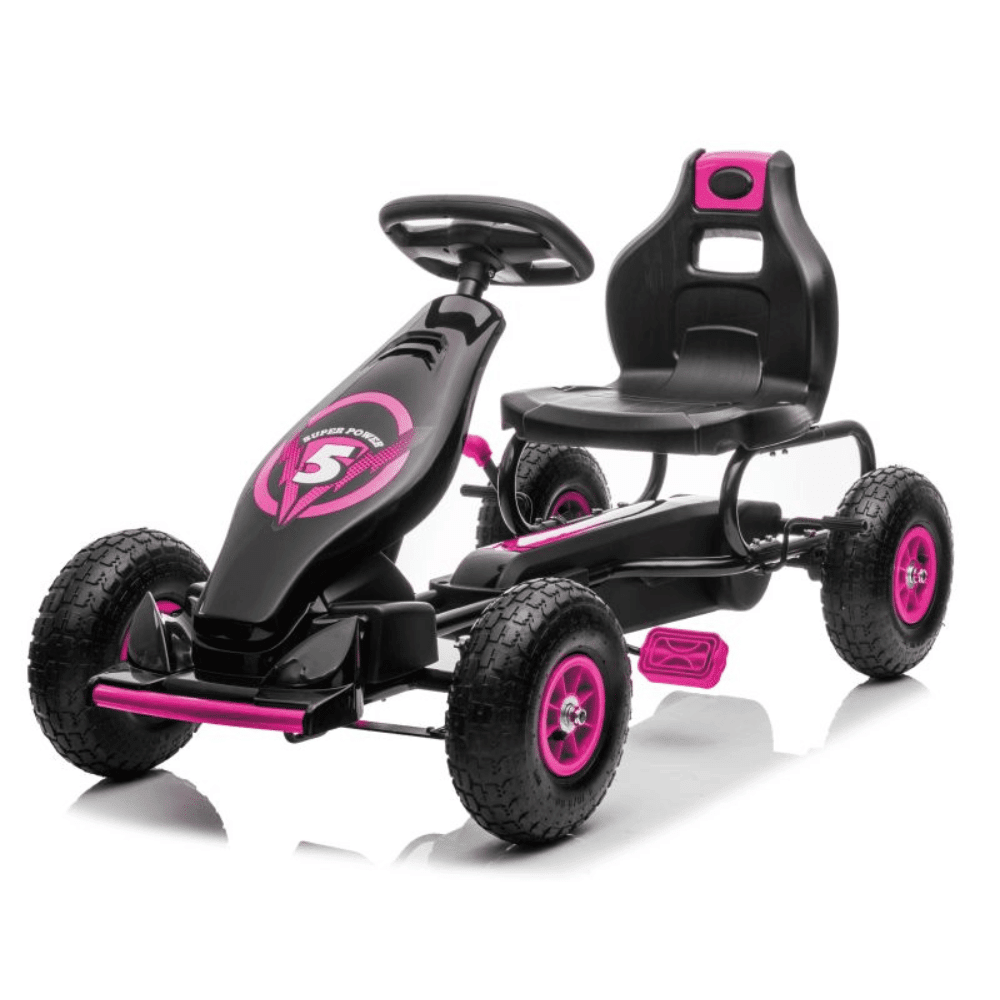 Gokart na pedały różowy idealny dla dzieci w wieku 3–8 lat. Maksymalne obciążenie 50 kg.